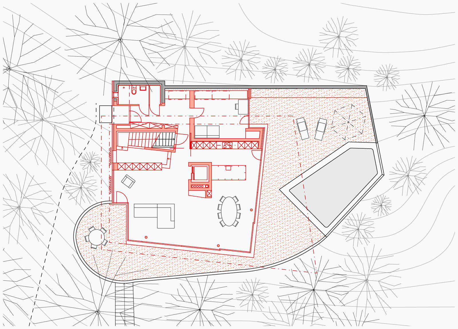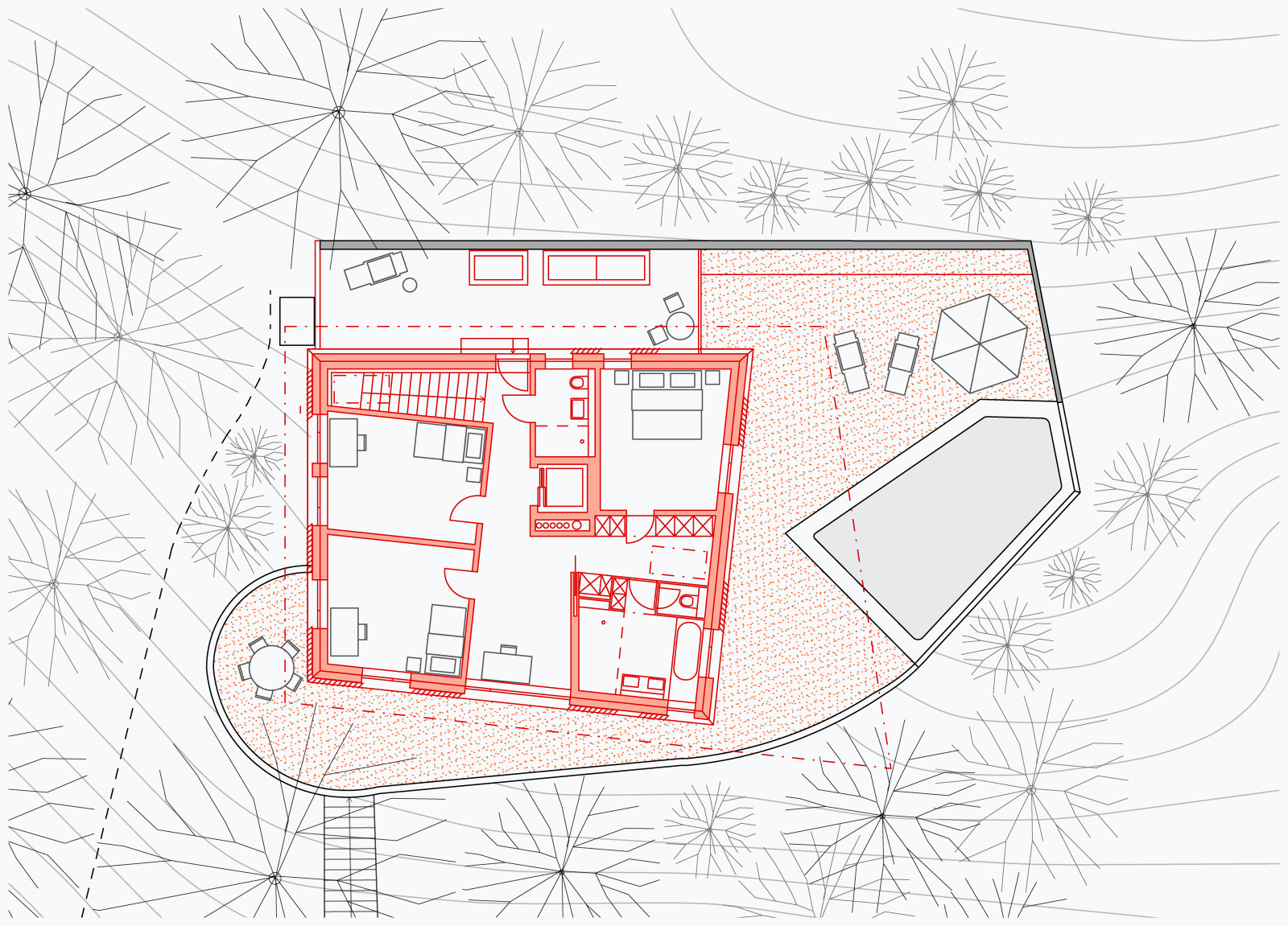 Lediglich der Sockelbau mit Büro und kleiner Wohnung sollte saniert und erhalten bleiben. Über diesem Sockelbau wurde ein markanter Kubus mit weit auskragendem Dach geplant. Er steht abgedreht über dem Sockel und öffnet sich einerseits einem ungehinderten Blick auf den Pilatus, andererseits verhindert er Einblicke der Nachbarn. Das Erdgeschoss wird durch eine grosse Fensterfront mit Schiebetüren abgeschlossen. Der dahinter liegende zusammenhängende Raum fürs Wohnen, Kochen und Essen wird dadurch grosszügig um die Terrasse und den bestehenden Pool erweitert. Eingang, Schrankfront, Arbeitsraum und Gäste-WC liegen im hinteren Teil des Gebäudes. Das Obergeschoss ist Rückzugsort. Die drei Schlafzimmer, Nasszellen, Ankleide-, Arbeits- und Spielräume sind deswegen bis auf Brüstungshöhe lediglich mit Lochfenster sowie Lamellenschiebeläden versehen. Blicke in die Baumkronen sind bestimmend. Natürliches Licht, das übers Dach in die Räume fliesst, schafft tolle Lichtstimmungen.