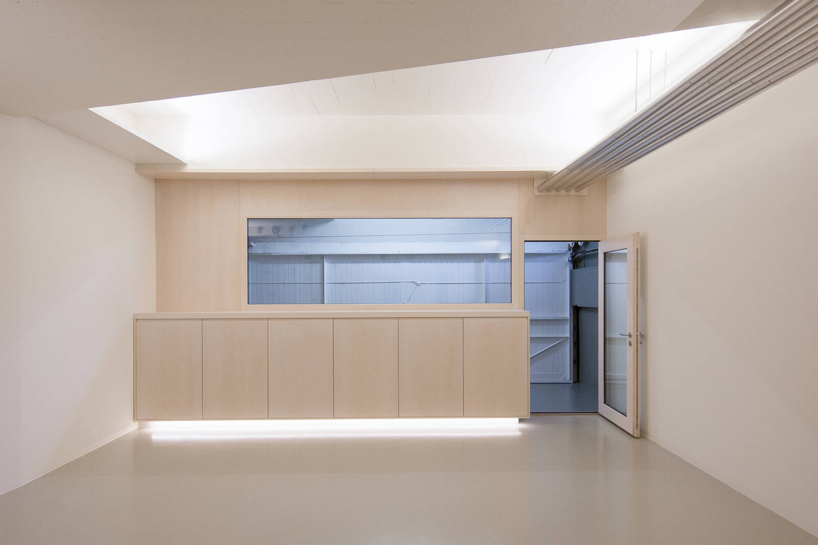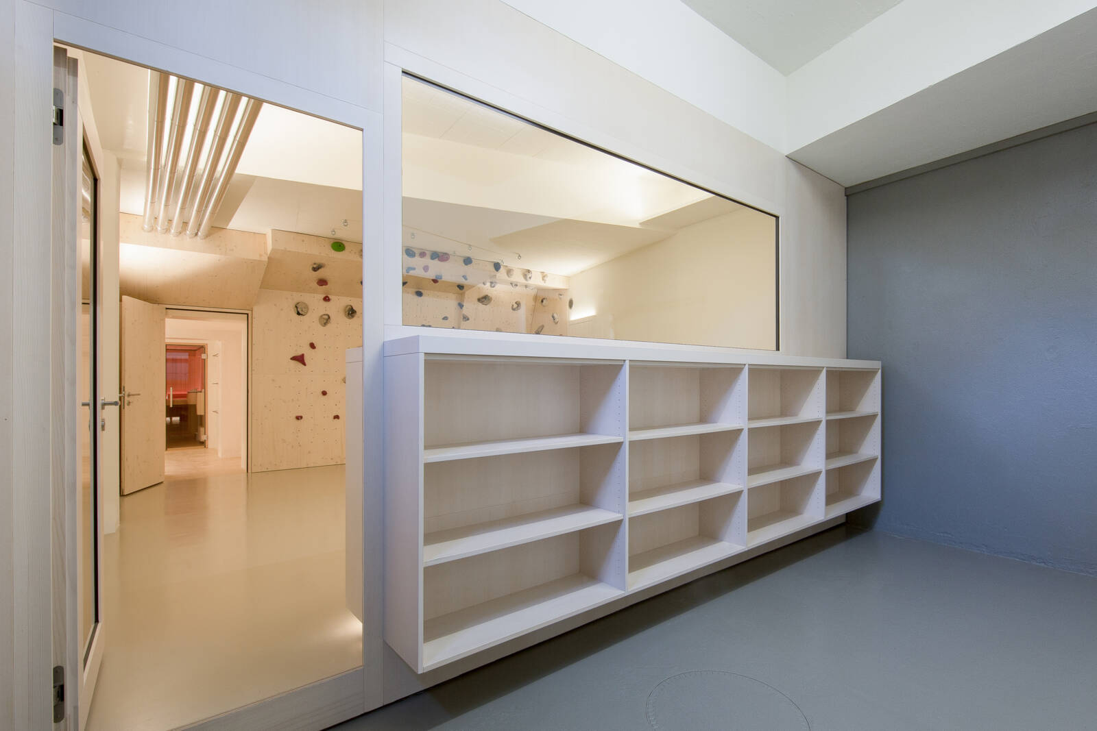 Die sportbegeisterte Familie des Einfamilienhauses wünschte sich Bewegungsräume im Haus. Was lag da näher, als die ungenutzte Garage auf dem Grundstück zu einem Ort für Fitness und Wellness auszubauen? Nach dem Umbau unterteilt eine verglaste Trennwand die Garage in zwei Hälften: Hinten entstand ein beheizter Fitnessraum, vorne blieb ein Einstellplatz erhalten. Entlang der gesamten Raumbreite der Garage wurde eine Kletterwand eingebaut, deren Form den bestehenden Raumgeometrien folgt und die bestehenden Haustechnikleitungen verbirgt. Neben der Kletterwand führt eine Türe in die ehemalige Waschküche, die sich heute als edlen Wellnessraum mit Sauna und Tauchbecken aus Travertinstein präsentiert. Dieser Naturstein wurde sowohl für den Boden als auch für das Wasserbecken gewählt. Er unterstützt die optische Verbindung des Raums und hat eine angenehme Haptik. Damit konnte aus der rohen Gestalt der Garage und der Waschküche eine Oase der Ruhe geschaffen werden.