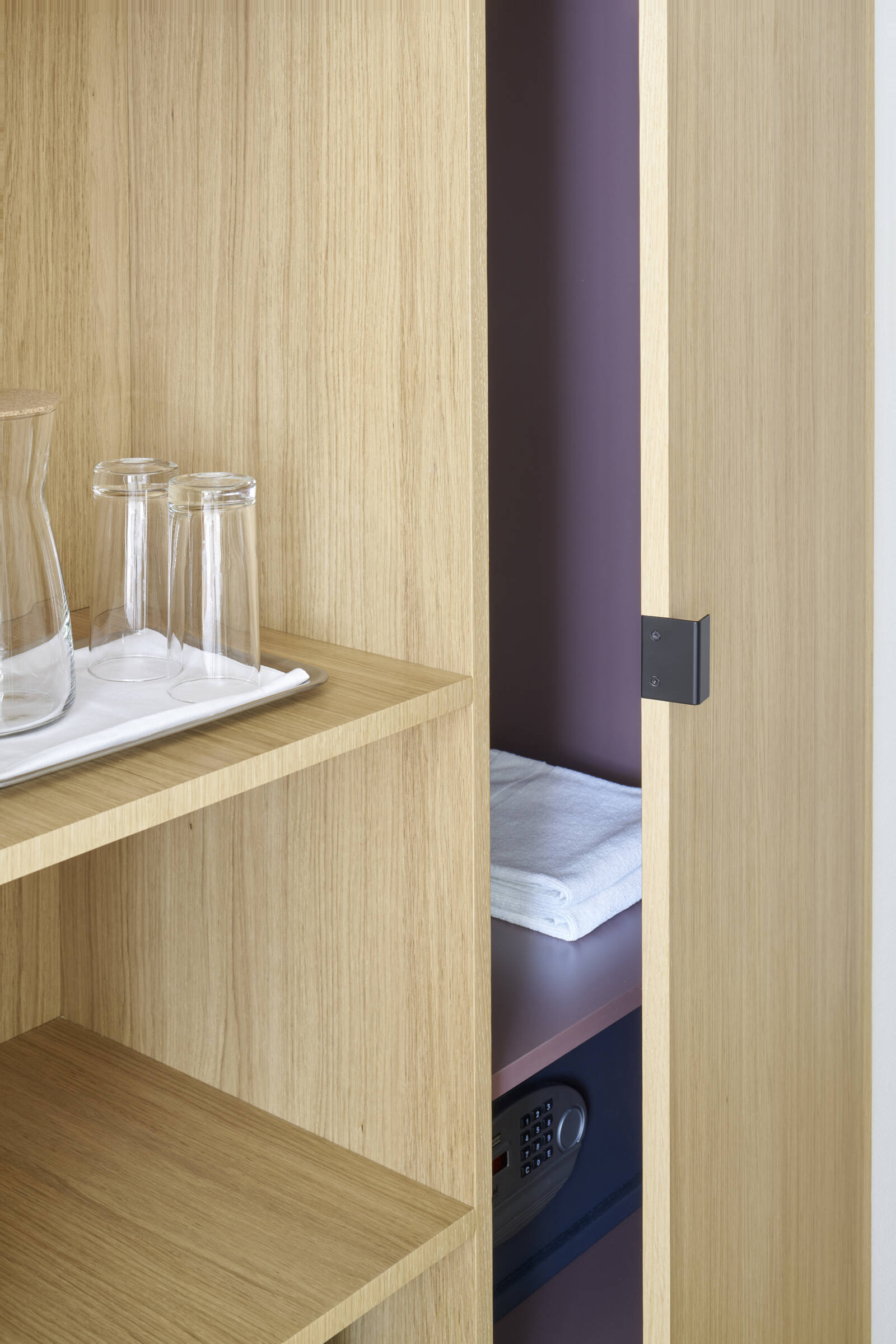 Schon vor über 650 Jahren nächtigten Durchreisende im Hotel Helmhaus in der Zürcher Altstadt. Damals wurden die Stadthäuser eng aneinander gebaut und ihre Räume waren viel kleiner strukturiert als heute, so auch diejenigen des Gasthofs beim Helmhaus. Diese Kleinteiligkeit wurde in den letzten Jahren mit zeitgemässen Elementen verbunden, die Interieurs der Hotelzimmer sind jedoch in die Jahre gekommen und entsprechen nicht mehr den Bedürfnissen der Gäste. Sie sollen deshalb ein neues Kleid erhalten, ohne aber den Charme des alten Hauses zu beeinträchtigen. Was seit dem Mittelalter gleich geblieben ist: Der Gast tritt ein und lässt das Stadtgewusel hinter sich. Im Hotel kommt er zur Ruhe, genehmigt sich eine Erfrischung und legt sich später ins Bett. Am nächsten Morgen findet er die nötige Musse und den Platz, um sich etwa auf einen Vortrag vorzubereiten. In Anlehnung an diese Abfolge hat Liis Architektur ein Ausbaukonzept erarbeitet, das sich auf alle Zimmer übertragen lässt. Weil der Ausbau der Zimmer während des Betriebs vorgenommen werden muss, werden sie in Etappen umgebaut. Ein erstes Zimmer zeigt sich nun in neuer Eleganz (die anderen werden folgen): Die auffallenden Bettrücken sowie die neuen Schränke sind aus edlem Eichenholz speziell für das Hotel angefertigt worden. Sie verbinden sich optisch mit dem Eichenparkett und lassen das Zimmer grösser erscheinen. Öffnet der Gast den Schrank, überrascht ihn ein kräftiges Lila. Die in sanftem Grünton eingefärbte Rückwand sowie die Leuchten, Nachttische, der mobile Sekretär und die Garderobe geben sich zurückhaltend und vollenden zusammen mit einem Bild der Künstlerin Gisèle Mengis den Charme des Zimmers.