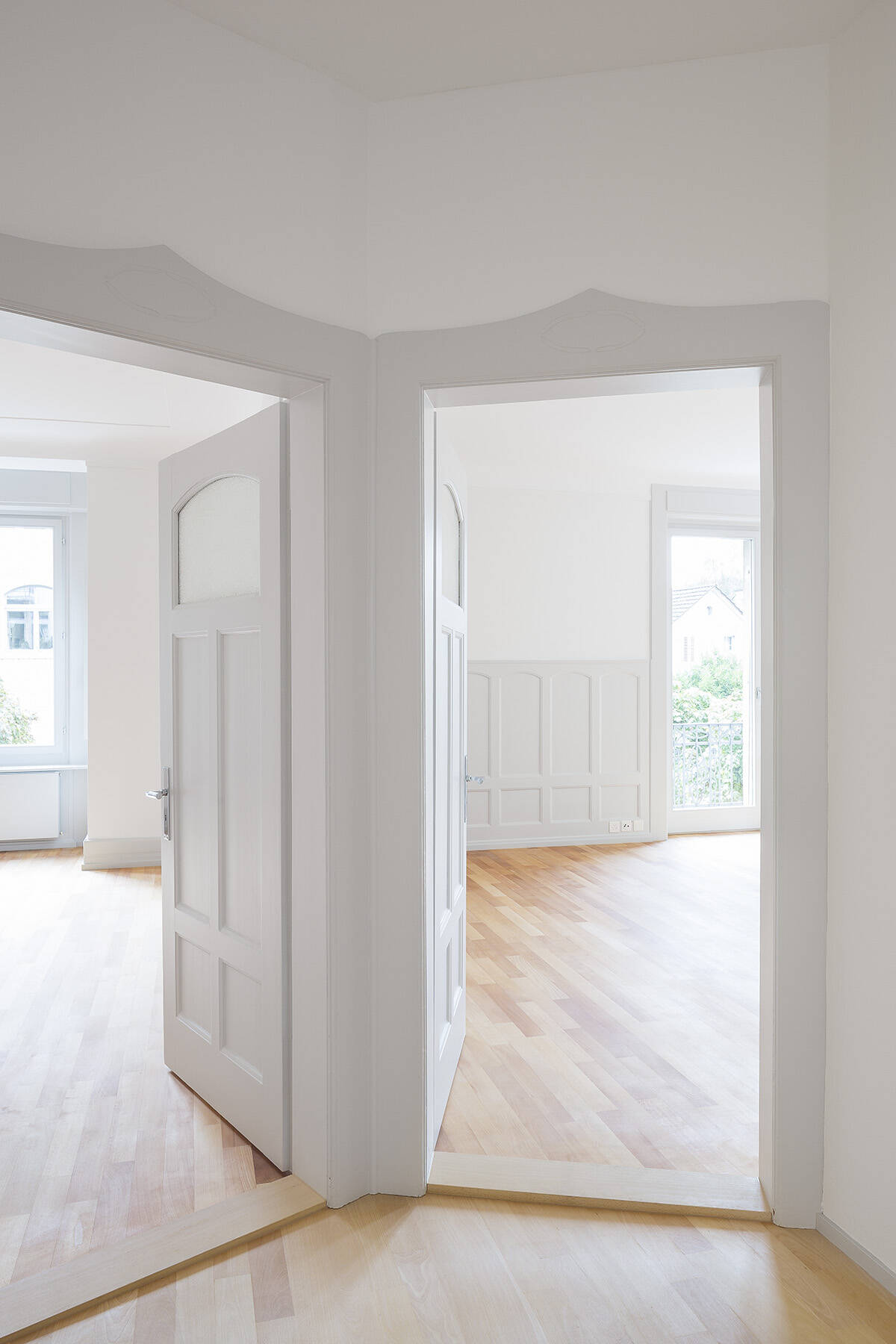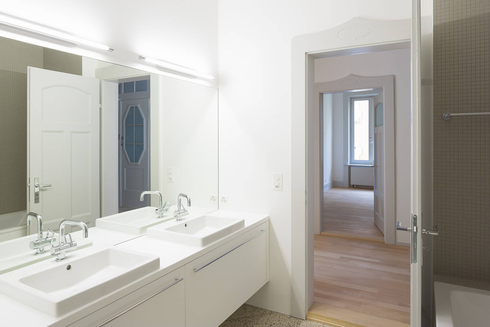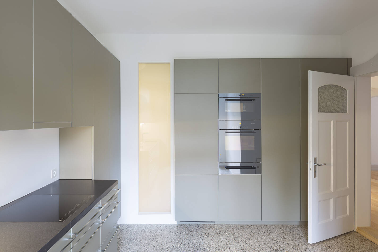 Ungebrochen gross ist das Interesse an Zürcher Altbauwohnungen. Sie überzeugen oft mit handwerklich sorgfältigem Ausbau und währschaften Materialien. Dem Charme einer solchen Wohnung kann sich niemand entziehen. Liis Architekten haben eine solche Fünfeinhalbzimmer-Eigentumswohnung in einem Eckhaus aus den 1930er-Jahren aufgefrischt und teilweise modernisiert, ohne die typisch grösszügige Gliederung der Räume zu verändern. Im Gegenteil: Bad und Küche wurden aufgewertet, in dem das alte Küchenreduit neu dem Bad zugeschlagen und mit einer Dusche und einer Toilette ausgerüstet wurde. Das Bad hatte vorher kein WC. Die verglaste Duschwand trennt die Küche vom Bad, lässt aber gleichzeitig Tageslicht ins Bad. Sowohl die Küche als auch das Bad wurden neu ausgestattet. Das separate WC blieb erhalten und wurde ebenfalls modernisiert. Die Parkett- und Terrazzoböden in der Wohnung wurden teilweise erneuert und ergänzt, die verputzten Wandoberflächen aufgefrischt.