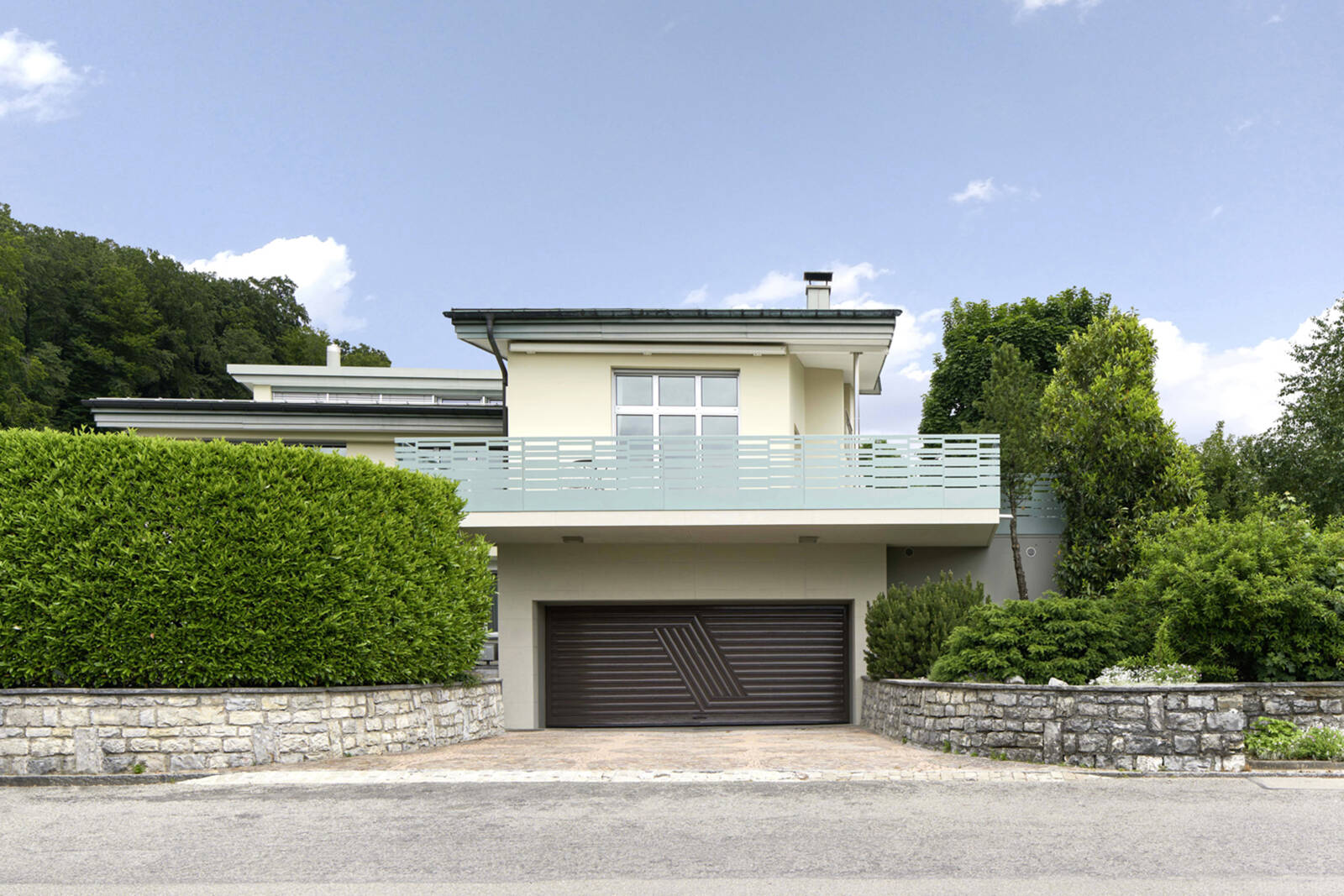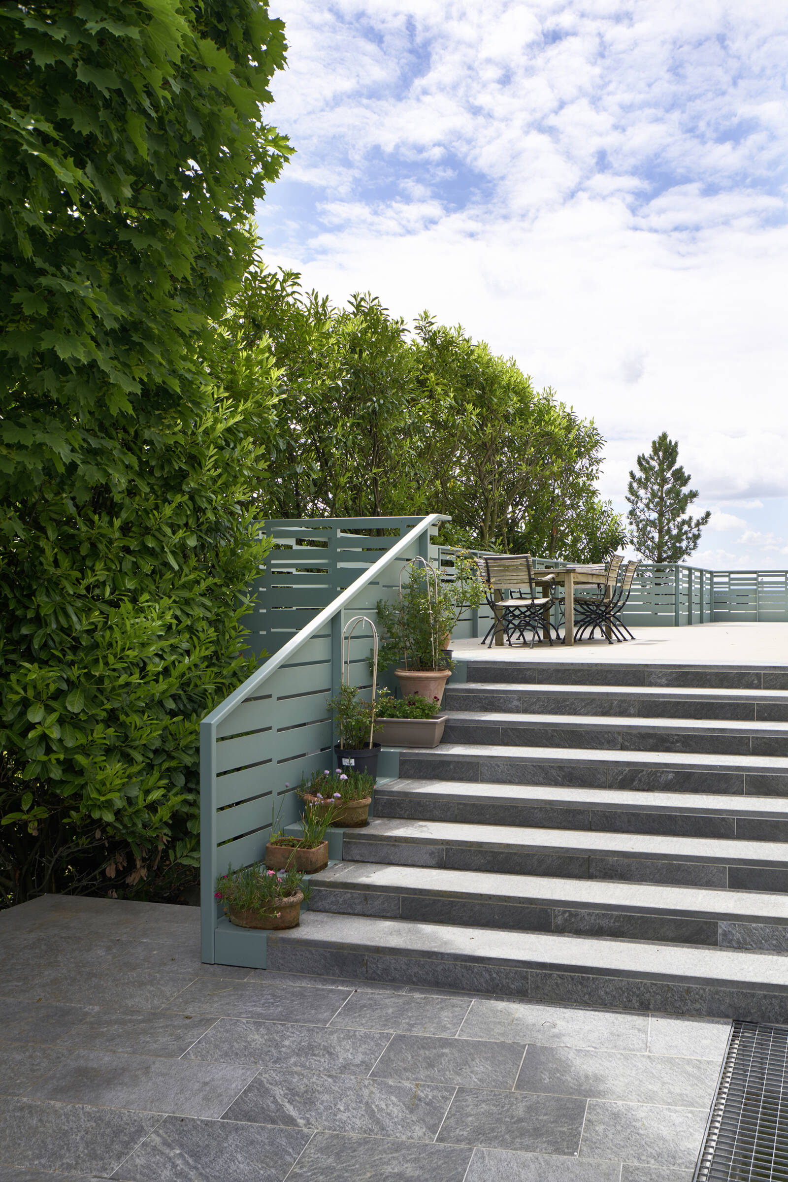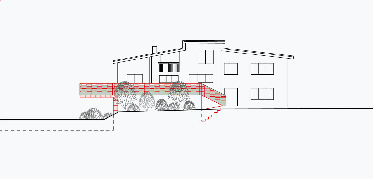Vor ein paar Jahren wurde ein Einfamilienhaus in Uitikon mit Wellness- und Fitnessräumen ausgestattet [Einfamilienhaus Haldenstrasse, Uitikon]. Die Besitzer des Hauses sind nicht nur sportlich, sondern geniessen auch häufig die Sonne auf der Terrasse. Weil die Terrasse auf der Sonnenseite aber recht klein war, wünschten sie eine Vergrösserung. Eine Art Sonnendeck, wie es auf Schiffen oder Terrassen am Mittelmeer zu finden ist, lässt das Haus aus den 1950er-Jahren nun in neuer Frische erscheinen. Wichtigstes Element ist das mäandrierende Geländer mit gelasertem Lochschlitzmuster, das vor fremden Blicken schützt, gleichzeitig aber Licht durchlässt. Farbe und Struktur des Geländers fügen sich als verbindendes Element ideal in das Haus ein, etwa das Grün, das die Farbe des gealterten Kupfers des Dachs aufnimmt. Die grosse Auskragung der Terrasse über der Garageneinfahrt war statisch schwierig zu lösen. Mit dem Anbau aus Sichtbeton gelang das auf elegante Art. Ausserdem wurden Teile des Umschwungs neu gestaltet: Die Flächen rund um das Haus verteilten sich auf zwei optisch getrennte Ebenen, die durch eine Treppe verbunden sind. Jetzt werden sie mit den neuen Bodenbelägen aus Quarzsand und Granitsteinen für die Sitzplätze als fliessende Einheit wahrgenommen. Und zusammen mit dem Sichtbeton der Terrasse, der Geländerfarbe und der Patina der bestehenden Materialien erscheint das Haus als harmonische Einheit.