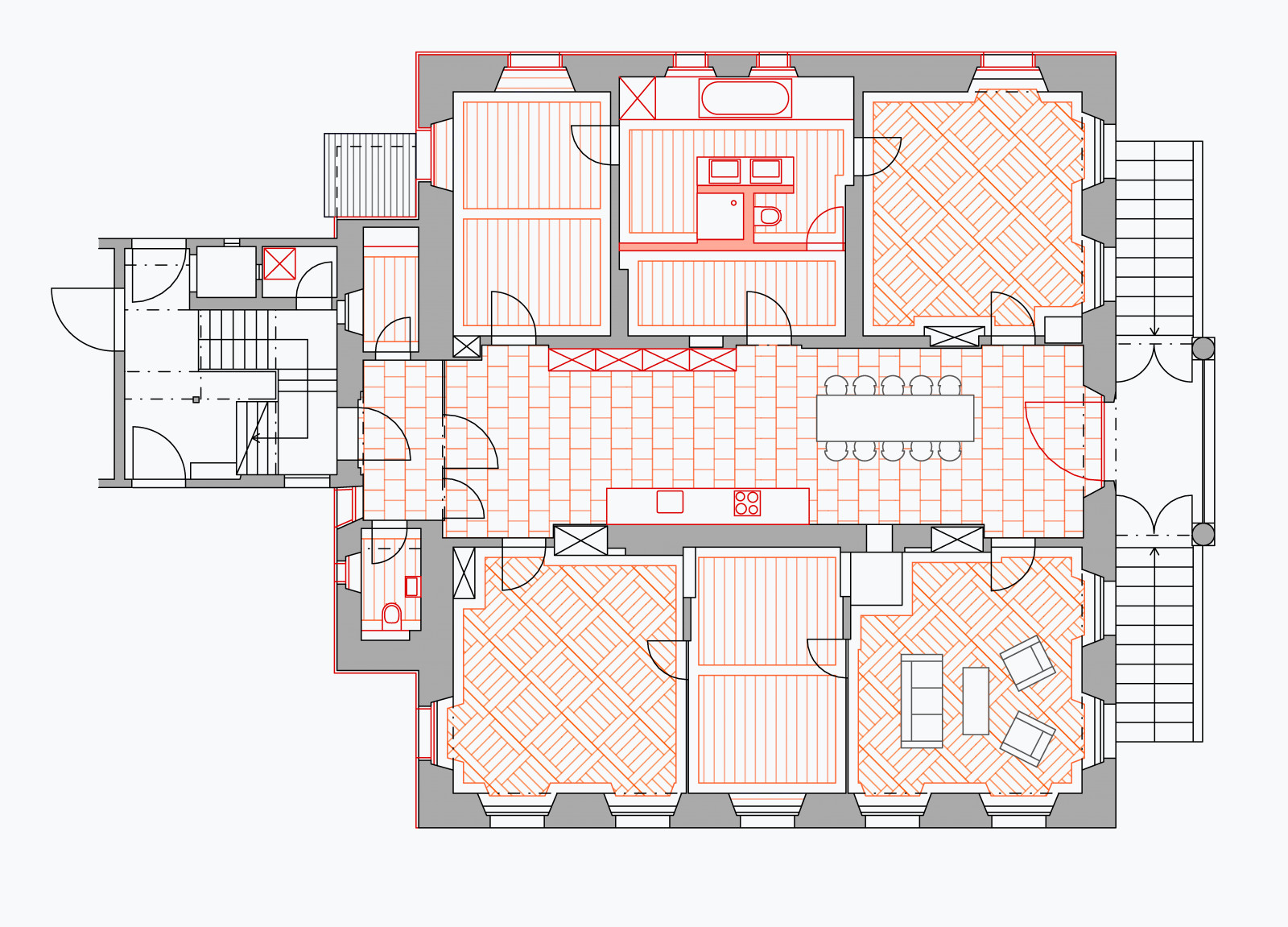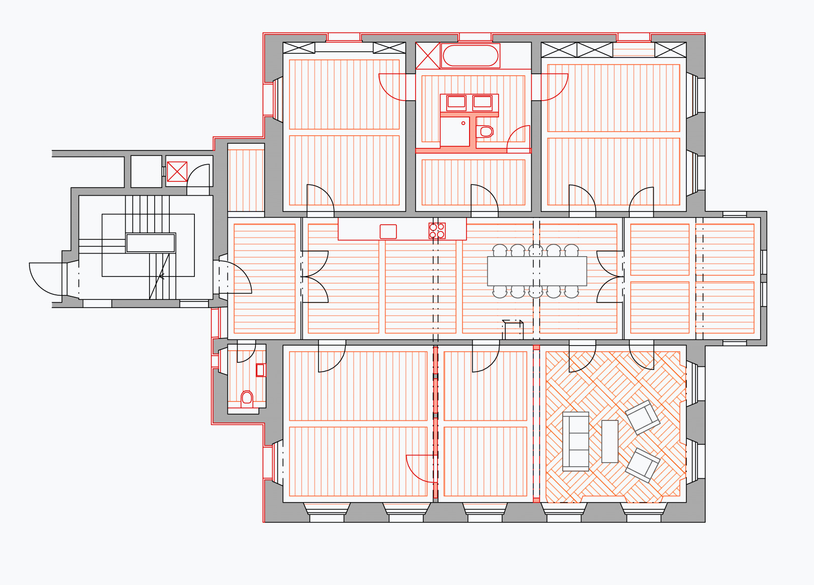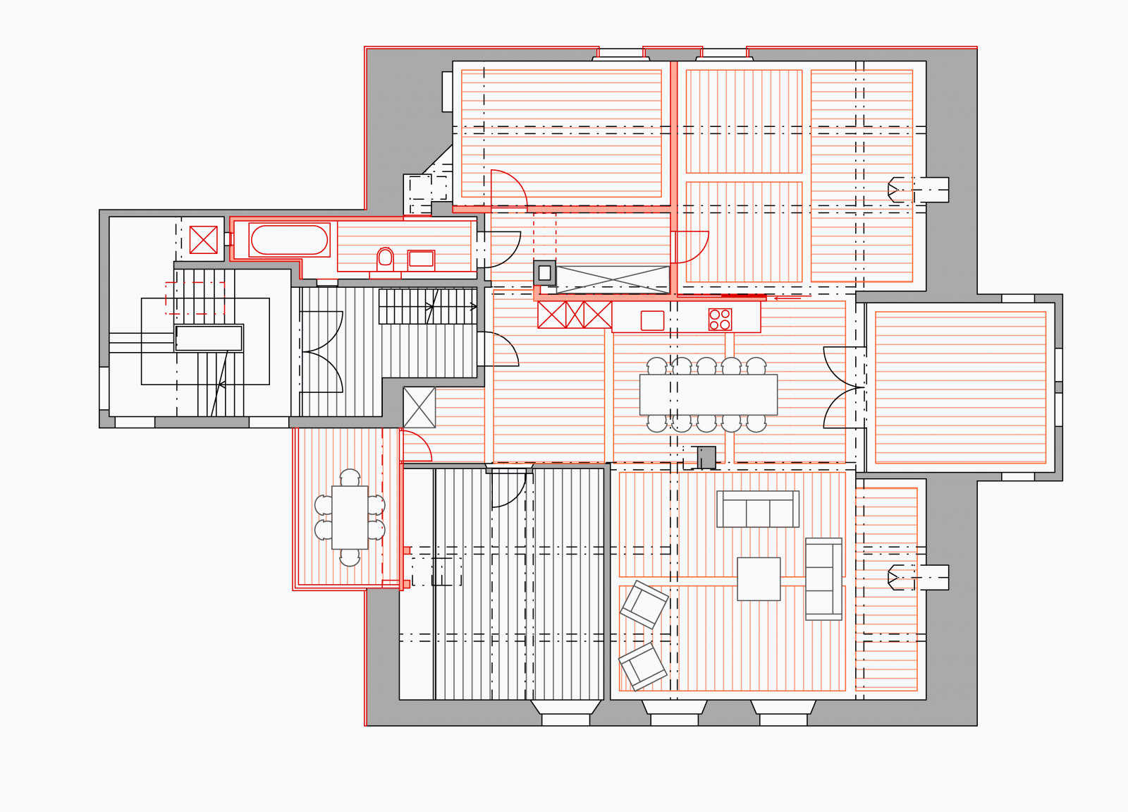 Das denkmalgeschützte Haupthaus des Gehrenhofs in Stäfa wurde 1691 erbaut. Es ist ein ausserordentlich schön erhaltener Zeuge sowohl der Seidenweberei als auch des Weinbaus am rechten Zürichseeufer. Entsprechend sorgfältig wurden die umfassende Sanierung und der Umbau zum Mehrfamilienhaus vorgenommen: Die historischen Wandmalereien in den Erkern wurden erneuert, die Fenster saniert und teilweise ersetzt. Die Fassade wurde mit Dämmputz versehen, Kellerdecke und Estrichboden gedämmt, der Gewölbekeller saniert. Die Steinböden im Erdgeschoss wurden aus-, der Unterbau neu aufgebaut, mit einer Bodenheizung ausgerüstet und danach Stein für Stein wieder verlegt. In jedes Geschoss wurde eine Wohnung eingebaut, wobei die originalen Parkettböden, die teilweise mit Intarsien versehen sind, neu verlegt werden mussten. Die Wände erhielten einen natürlichen Sumpfkalkputz, die Decken wurden saniert. Dank neuen Küchen und Nasszellen sowie einer zeitgemässen Haustechnik lässt es sich im Gehrenhof komfortabel wohnen. Der Umbau kann als gelungenes Beispiel gelten, wie historisch wertvoller Bestand mit modernen Einbauten ergänzt und damit zu einem Lebensraum für die Zukunft werden kann.